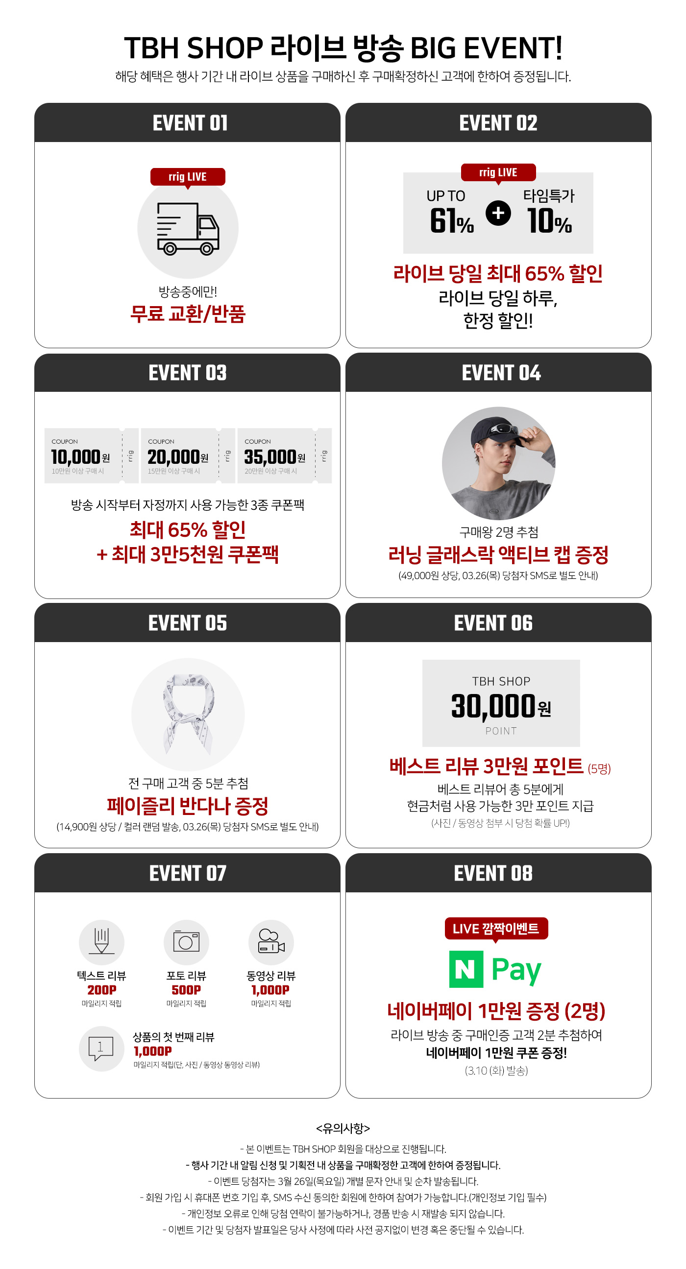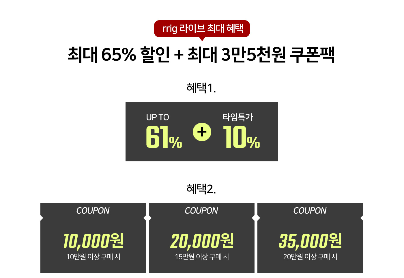 라이브 당일, 최대 65% + 최대 3.5만원 쿠폰팩🎁