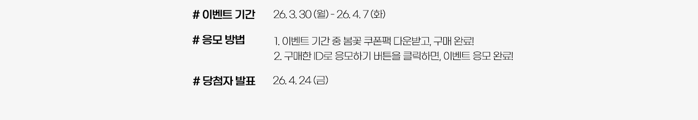 - 이벤트 기간동안 1) 봄꽃 쿠폰팩 사용 후, 2) "이벤트 응모하기" 신청한 고객에 한 해 자동 응모됩니다.